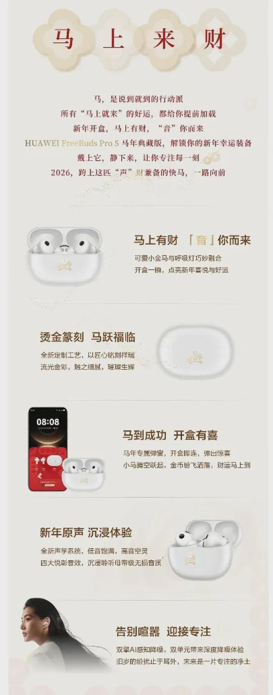 华为每年都紧跟生肖潮流推出特别版耳机,此前有推出龙年版、蛇年版,到今年的 FreeBuds Pro 5 马年版,这传统延续得相当稳。